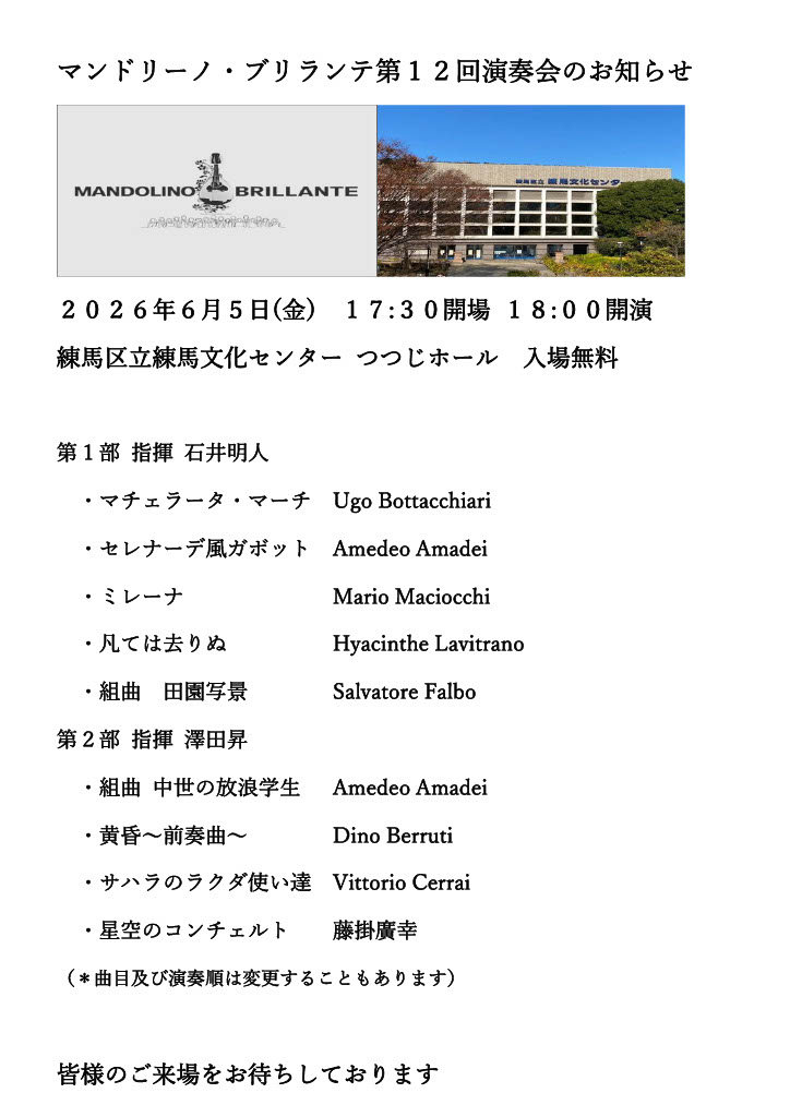 マンドリーノ・ブリランテは、2010年1月に 旧マリプローザ・マンドリンの出身者等10数名で「古典マンドリンオリジナル合奏曲を楽しむ会」を発足しました。今では約30名の団員となり、これまで10数年の間に、月々更新しながら320曲余りの楽曲を楽しんで来ました。